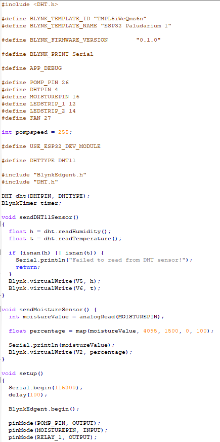 Hieronder kunnen jullie alvast een deel van onze code bekijken voor ons IoT-Based Paludarium. Deze code regelt momenteel de pomp, DHT11-sensor (temperatuur en luchtvochtigheid), LED-strip en meer. Uiteraard zal de code verder worden uitgebreid en geoptimaliseerd naarmate ons project vordert.